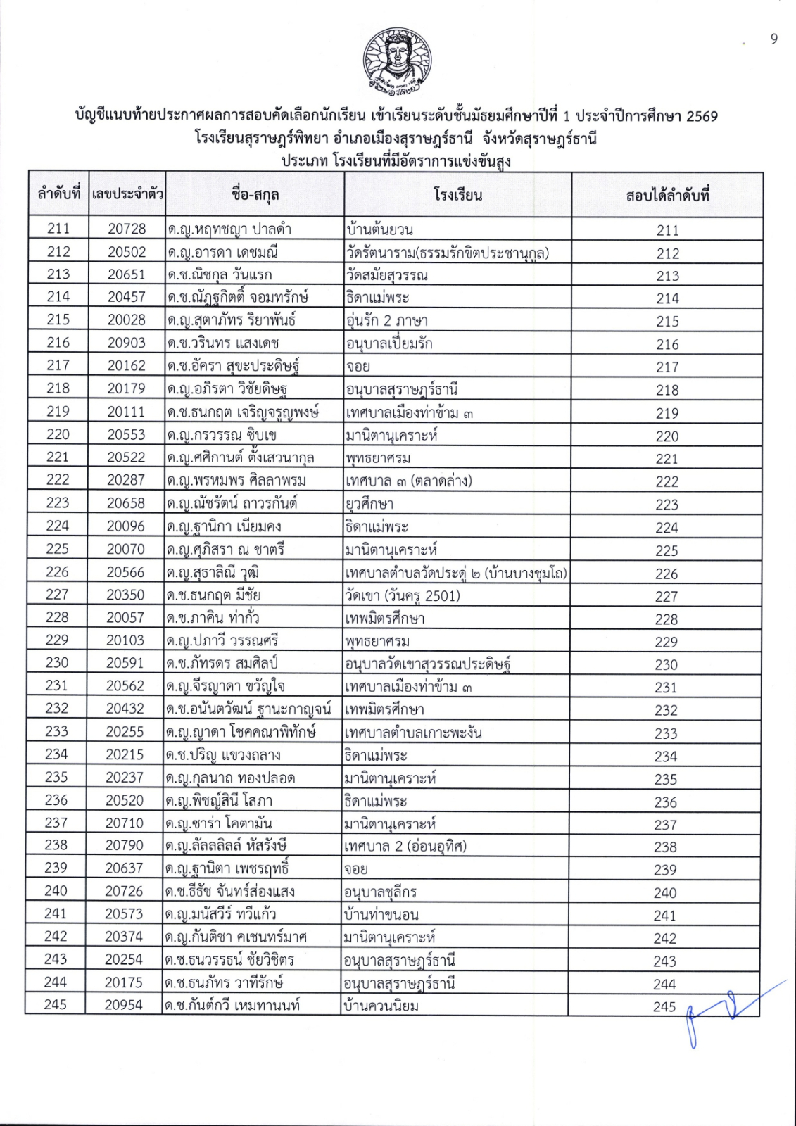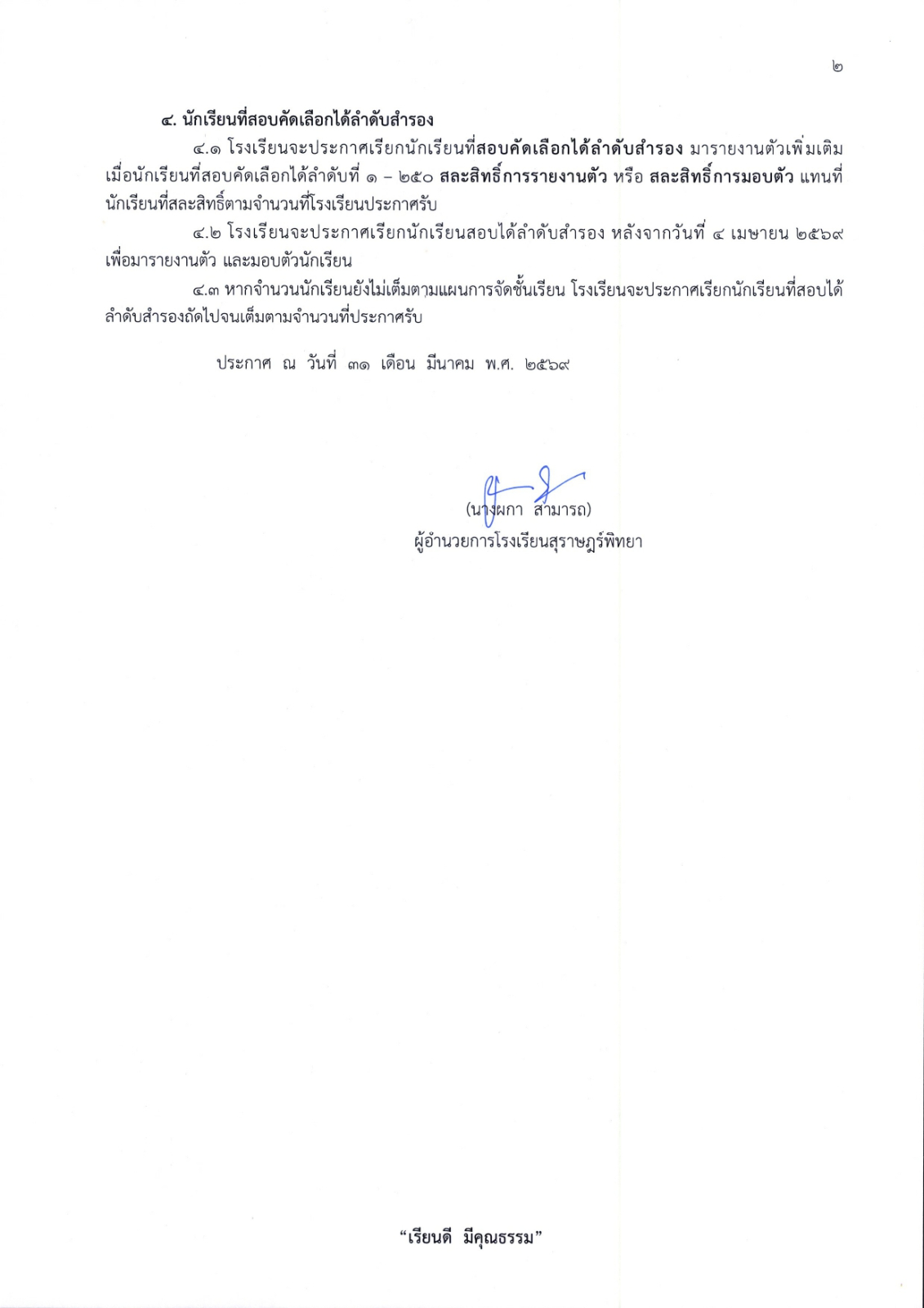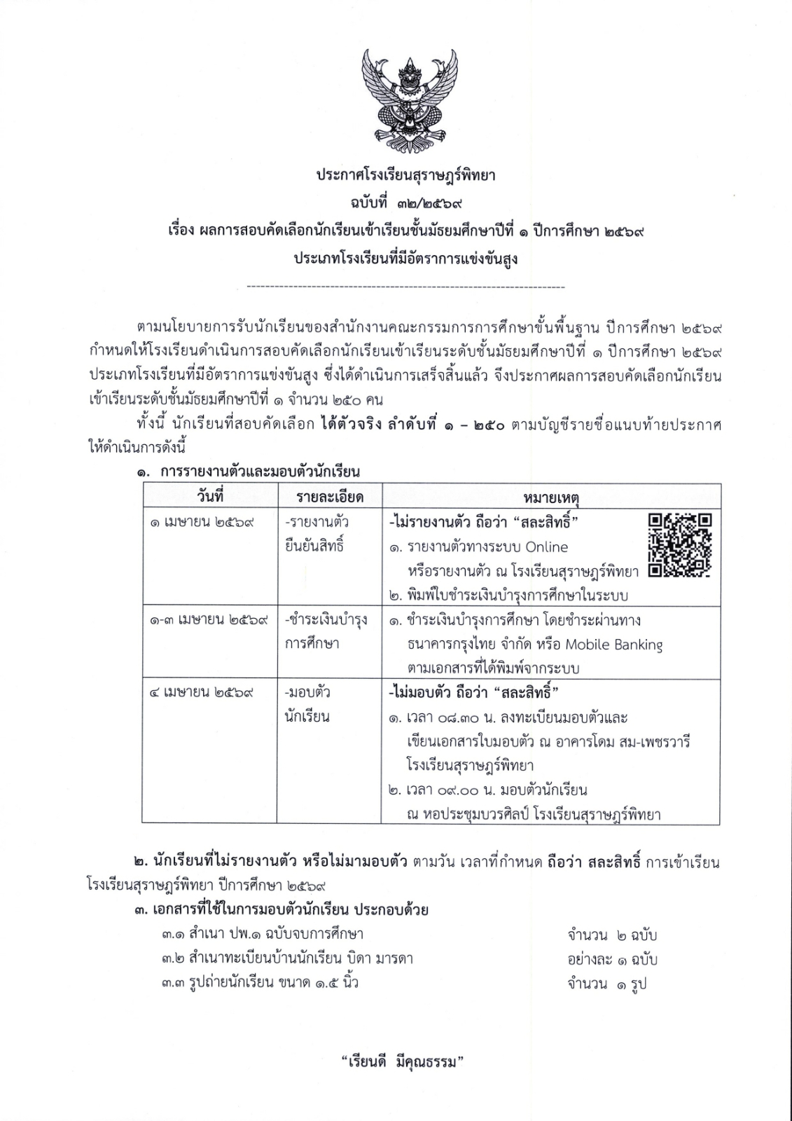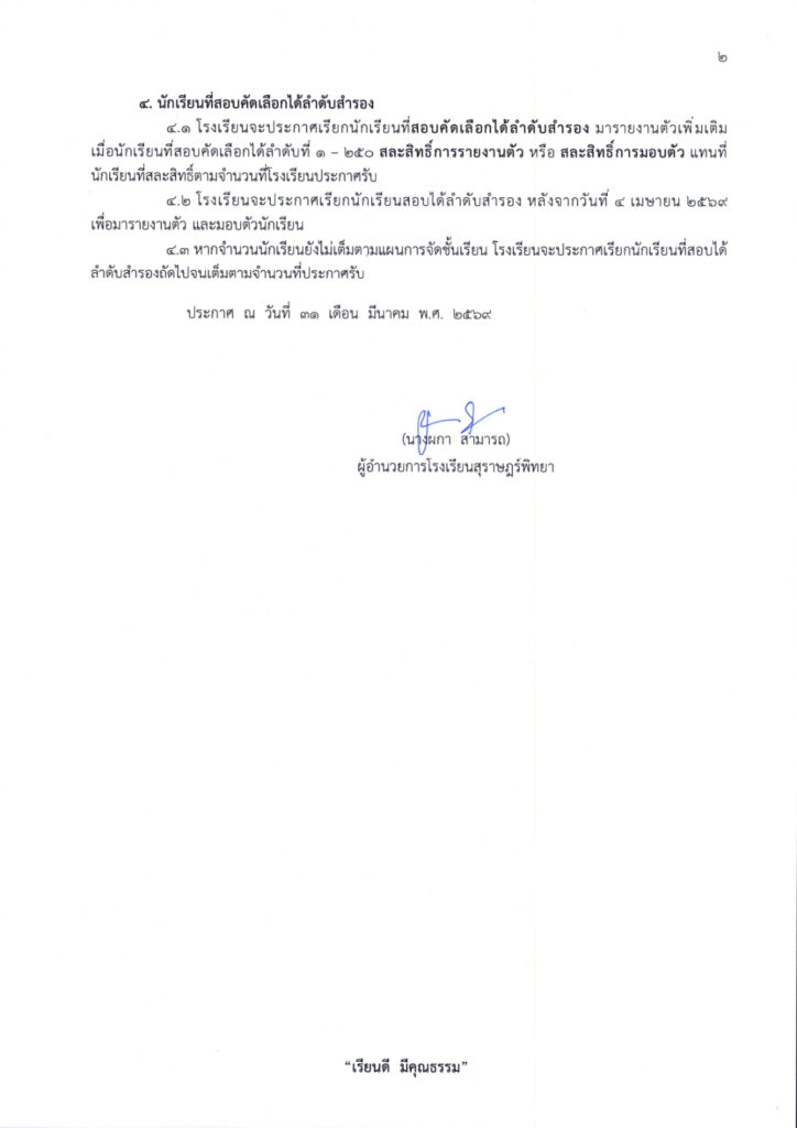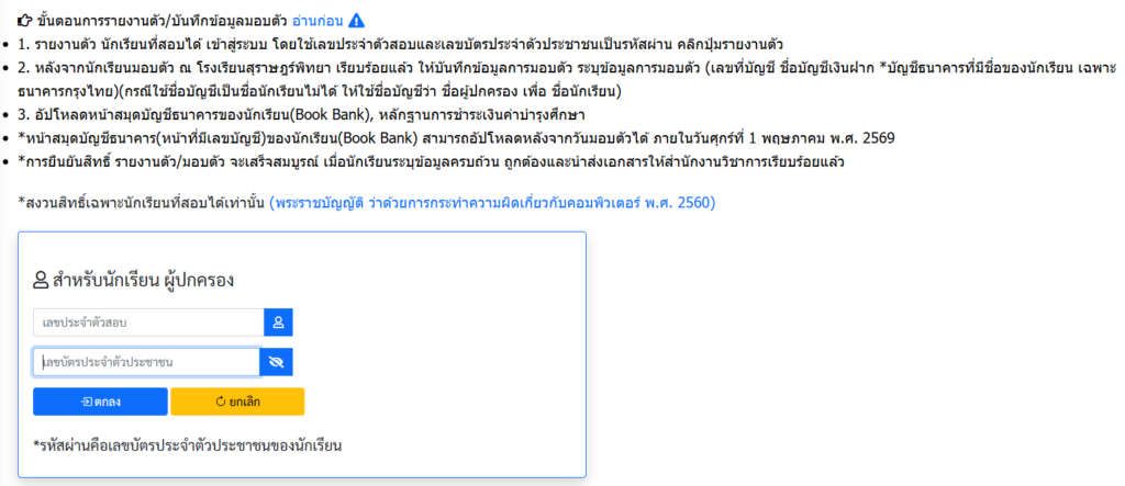 1. รายงานตัว วันพุธที่ 1 เมษายน พ.ศ. 2569 นักเรียนที่สอบได้ เข้าสู่ระบบ โดยใช้เลขประจำตัวสอบและเลขบัตรประจำตัวประชาชนเป็นรหัสผ่าน คลิกปุ่มรายงานตัว