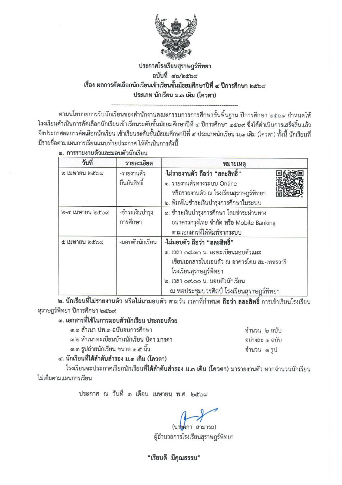 1. รายงานตัว วันพฤหัสบดีที่ 2 เมษายน พ.ศ. 2569 นักเรียนที่สอบได้ เข้าสู่ระบบ โดยใช้เลขประจำตัวสอบและเลขบัตรประจำตัวประชาชนเป็นรหัสผ่าน คลิกปุ่มรายงานตัว