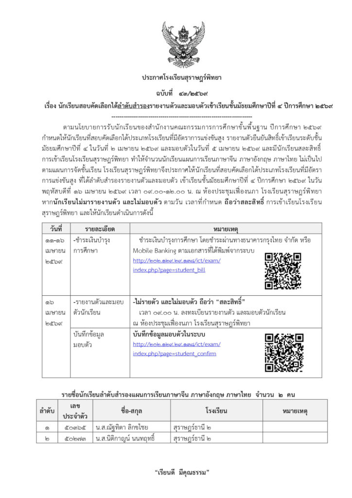 ประกาศนักเรียนสอบคัดเลือกได้ลำดับสำรองรายงานตัวและมอบตัว ม.4 ปีการศึกษา 2569 ประเภทโรงเรียนที่มีอัตราการแข่งขันสูง (ครั้งที่ 2) / ข่าวประกาศ, โรงเรียนแข่งขันสูง / By สุธน ภักดี Post Views: 4