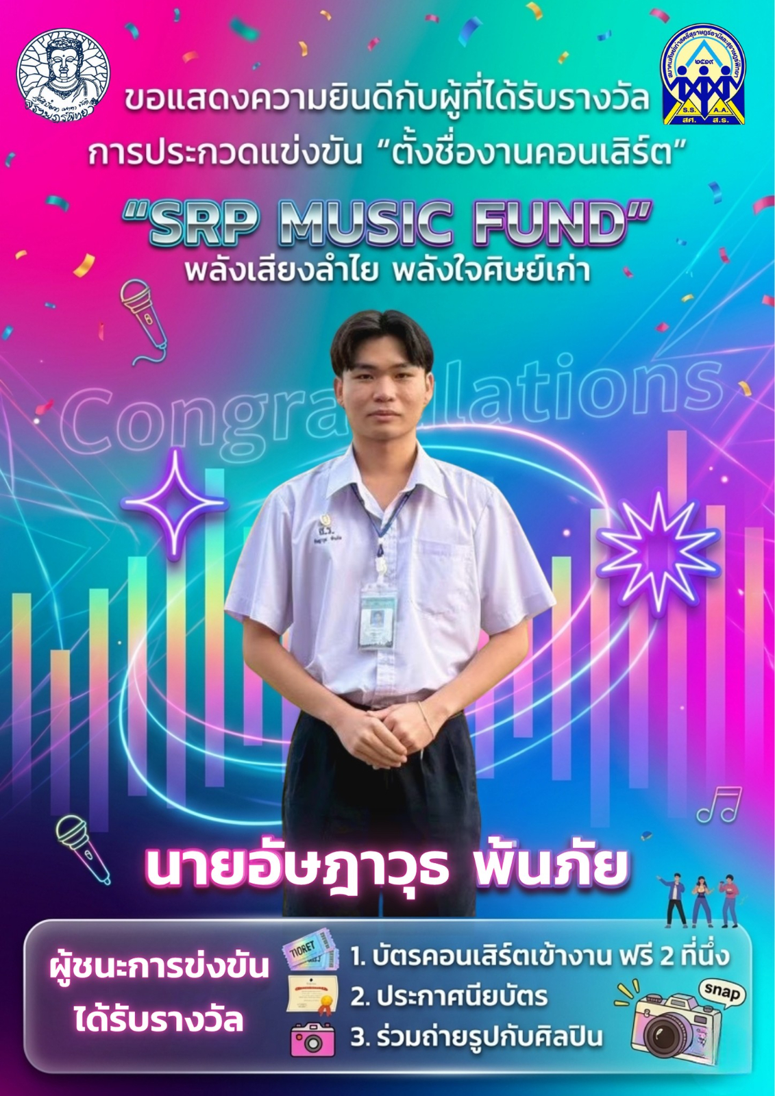นายอัษฎาวุธ พันภัย ชนะการประกวดแข่งขัน “ตั้งชื่องานคอนเสิร์ต” / ข่าวประชาสัมพันธ์ / By สุธน ภักดี โรงเรียนสุราษฎร์พิทยา ขอแสดงความยินดีกับ นายอัษฎาวุธ พันภัย ผู้ชนะการประกวดแข่งขัน “ตั้งชื่องานคอนเสิร์ต” ผลงานที่ได้รับรางวัล “SRP MUSIC FUND พลังเสียงลำไย พลังใจศิษย์เก่า”ผู้ชนะการประกวดได้รับรางวัล• บัตรคอนเสิร์ตเข้างาน ฟรี 2 ที่นั่ง• ประกาศนียบัตร• ร่วมถ่ายรูปกับศิลปิน “ลำไย ไหทองคำ”ผู้ที่ได้รับรางวัลให้ทักแชทเพจงานประชาสัมพันธ์ โรงเรียนสุราษฎร์พิทยา เพื่อยืนยันสิทธิ์และรับรายละเอียดเพิ่มเติม Post Views: 2