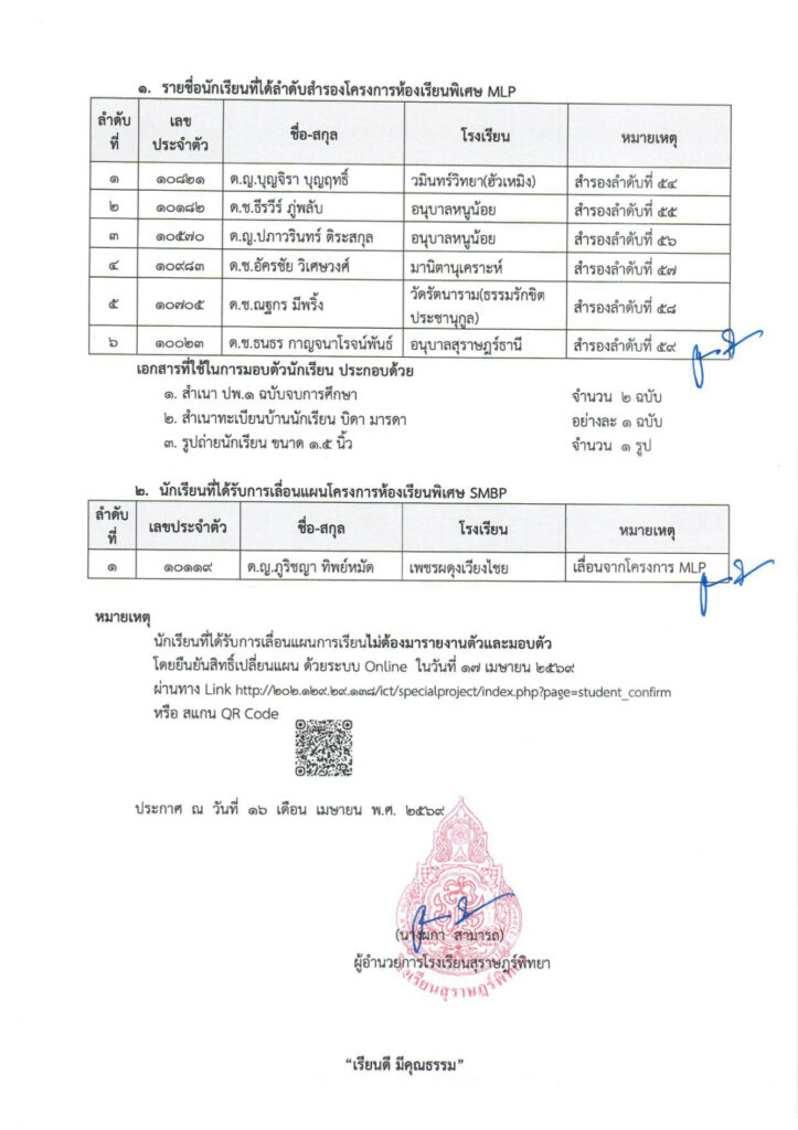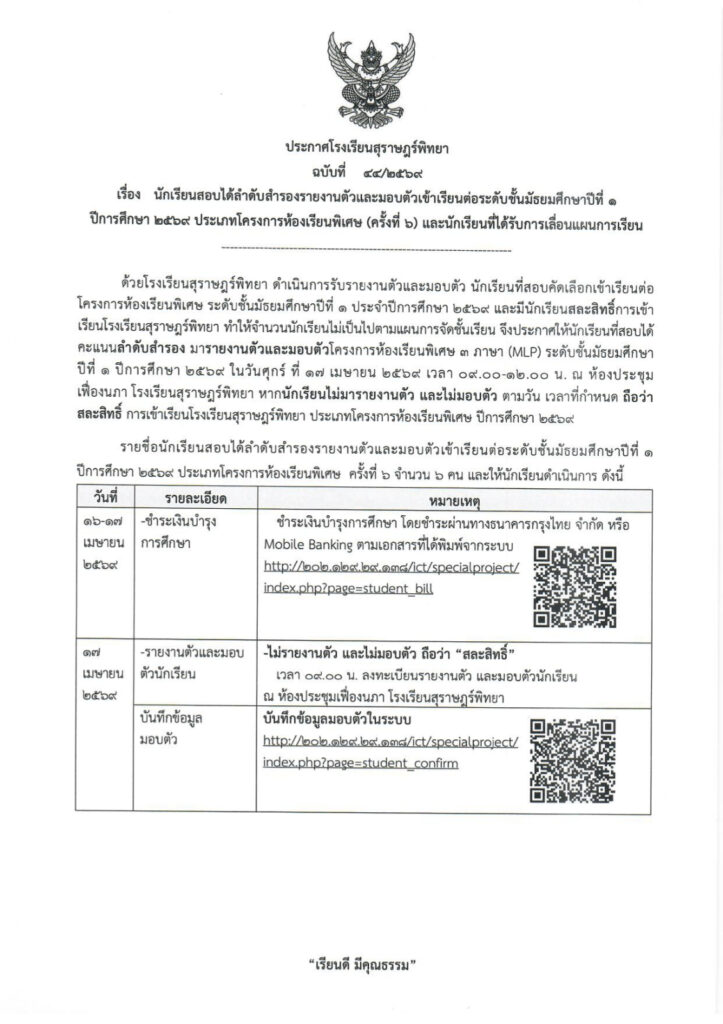 ประกาศนักเรียนสอบคัดเลือกได้ลำดับสำรองรายงานตัวและมอบตัว ม.1 ปีการศึกษา 2569 ประเภทโครงการห้องเรียนพิเศษ MLP (ครั้งที่ 6) และนักเรียนที่ได้รับเลื่อนแผนการเรียน / ข่าวประกาศ, โครงการห้องเรียนพิเศษ / By สุธน ภักดี บันทึกข้อมูลมอบตัว คลิกที่นี่พิมพ์ใบแจ้งค่าบำรุงการศึกษา คลิกที่นี่ Post Views: 31