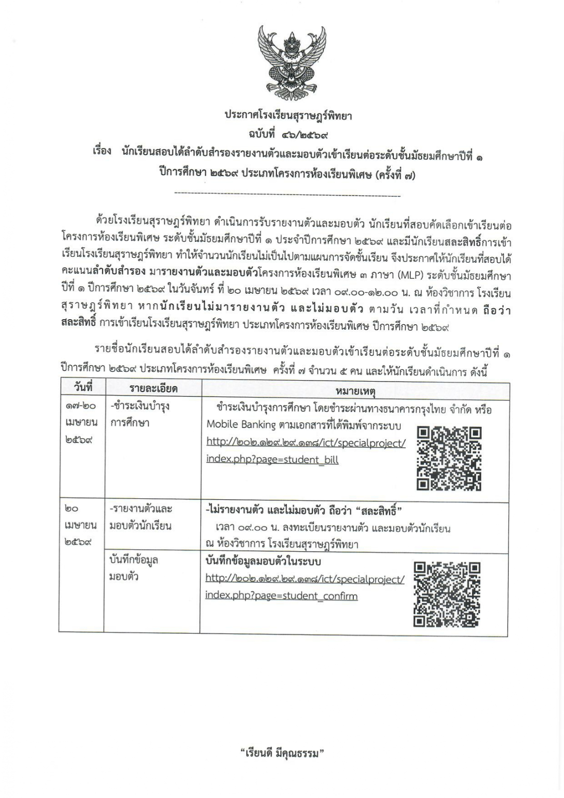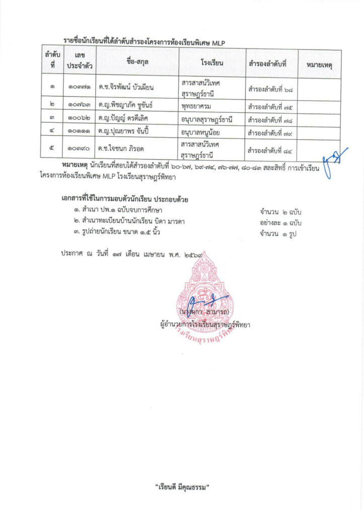 ประกาศนักเรียนสอบคัดเลือกได้ลำดับสำรองรายงานตัวและมอบตัว ม.1 ปีการศึกษา 2569 ประเภทโครงการห้องเรียนพิเศษ MLP (ครั้งที่ 7) / ข่าวประกาศ, โครงการห้องเรียนพิเศษ / By สุธน ภักดี บันทึกข้อมูลมอบตัว คลิกที่นี่พิมพ์ใบแจ้งค่าบำรุงการศึกษา คลิกที่นี่ Post Views: 46