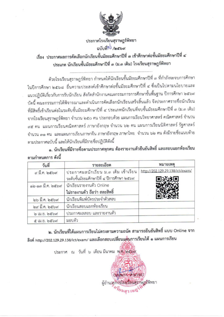ประกาศผลการคัดเลือกนักเรียนชั้นมัธยมศึกษาปีที่ 3 เข้าศึกษาต่อชั้นมัธยมศึกษาปีที่ 4 ประเภทนักเรียนชั้นมัธยมศึกษาปีที่ 3