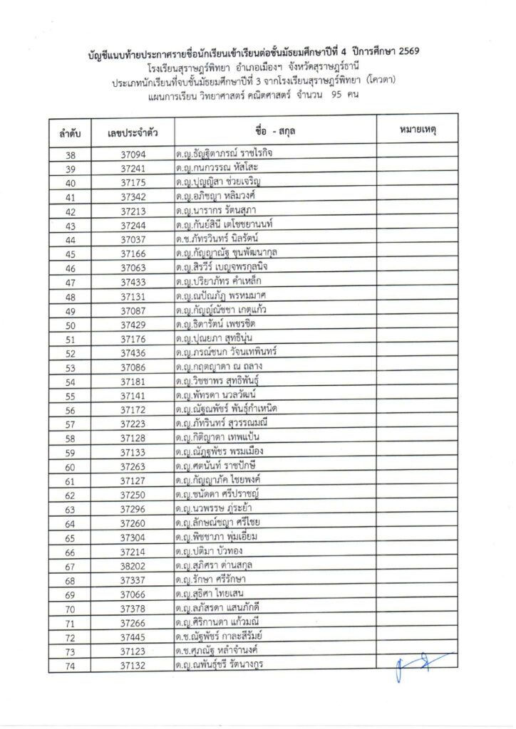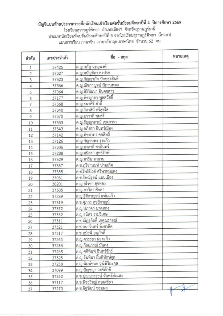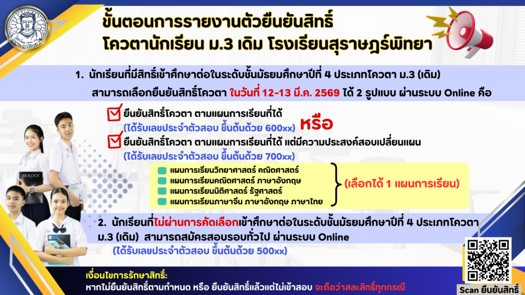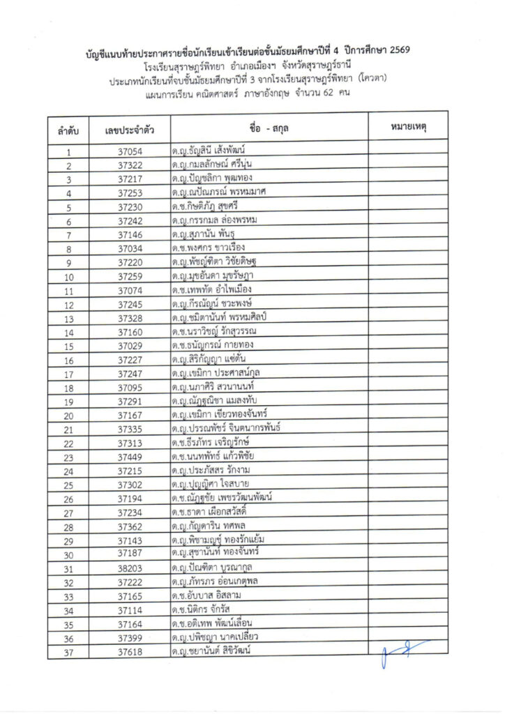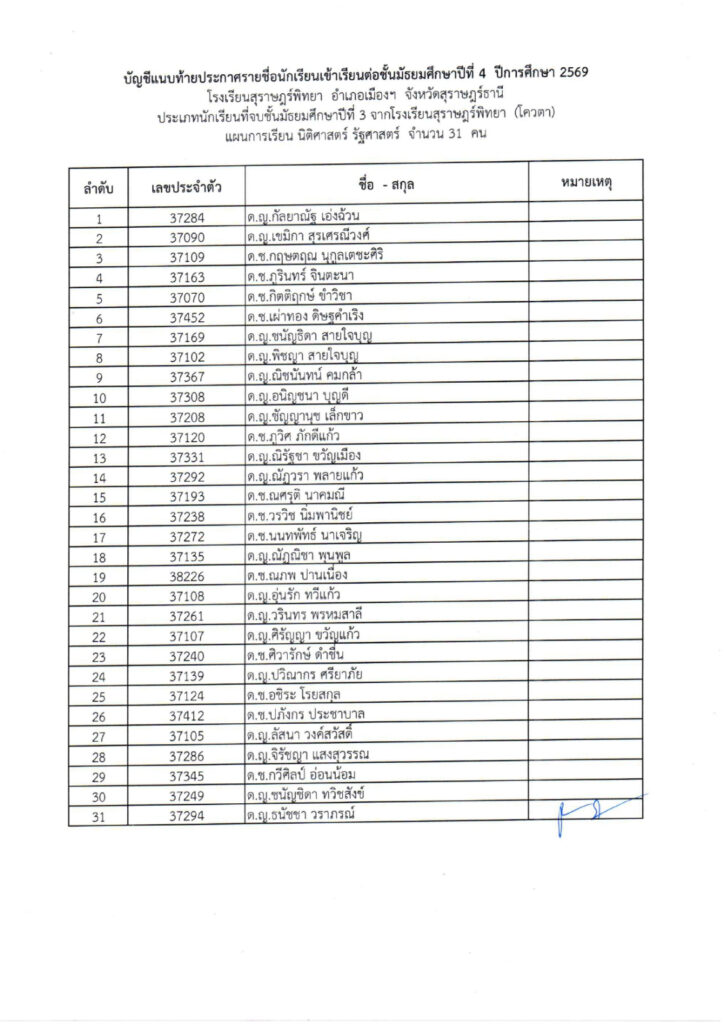 (ม.3 เดิม) โรงเรียนสุราษฎร์พิทยา ปีการศึกษา 2569