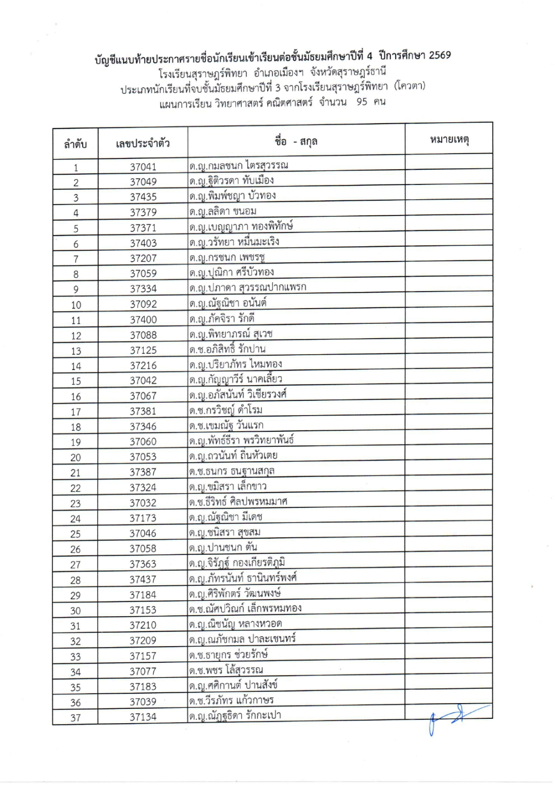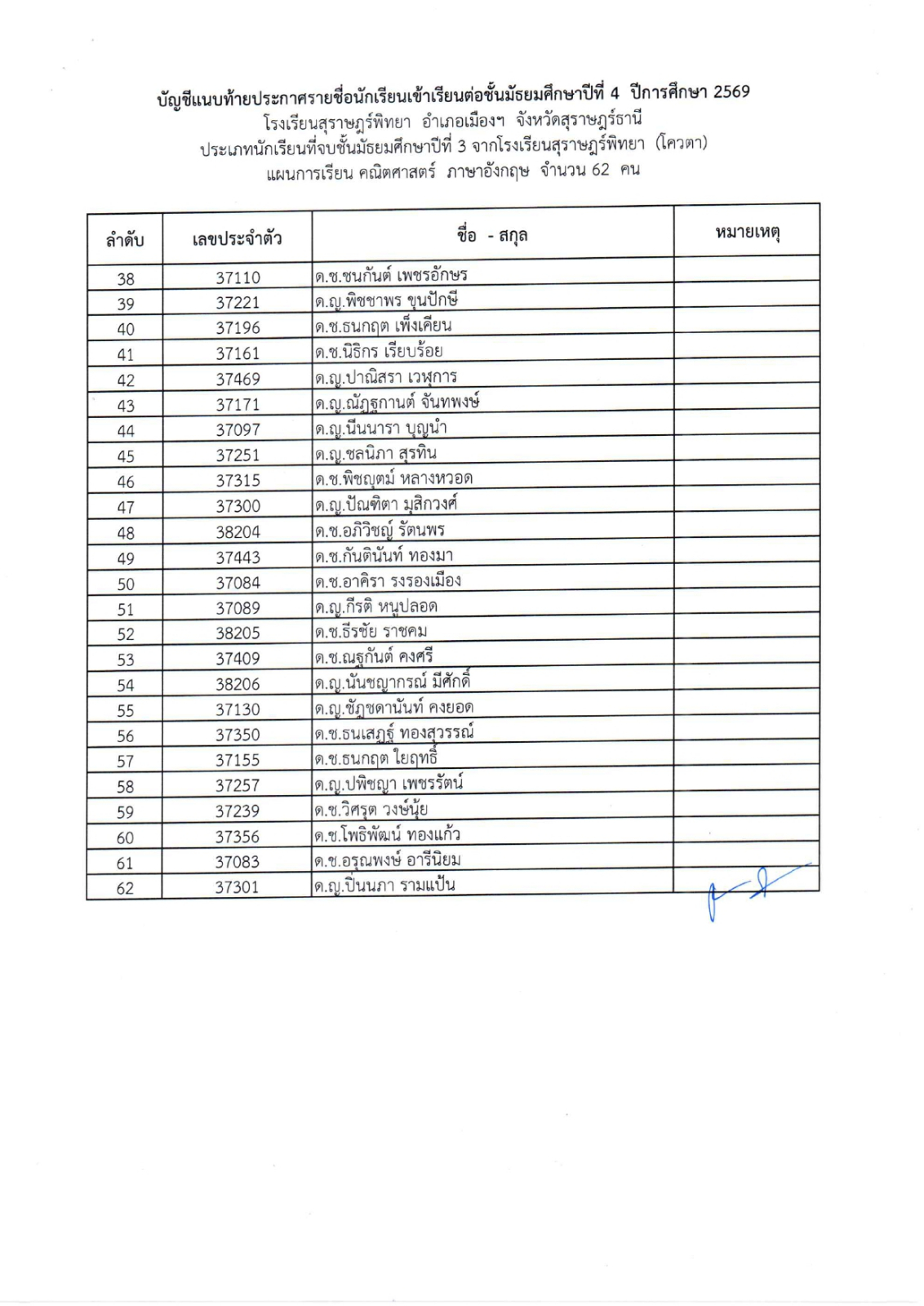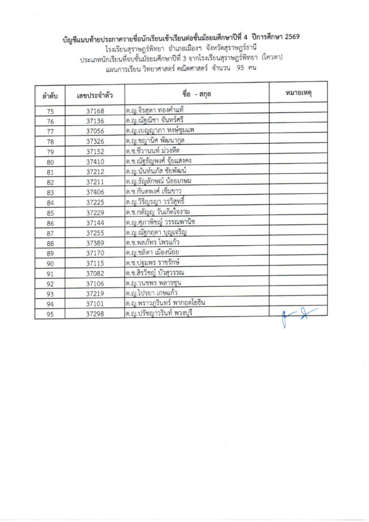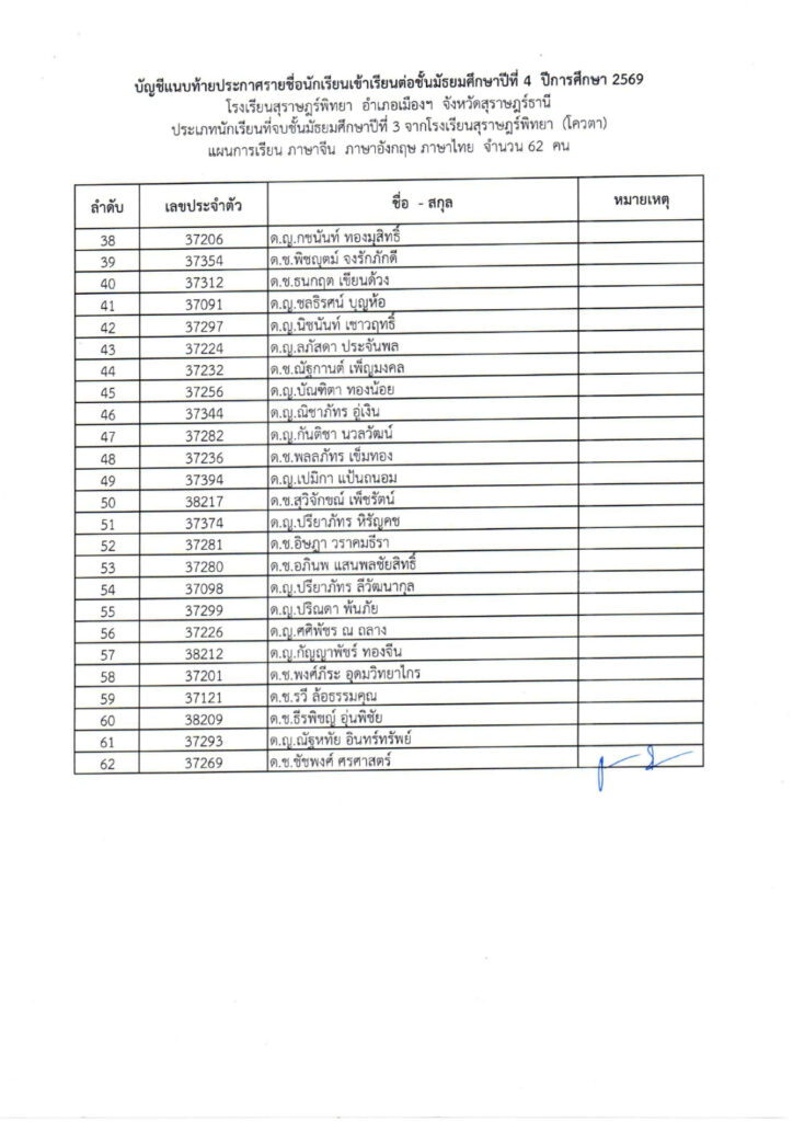 (ม.3 เดิม) โรงเรียนสุราษฎร์พิทยา ปีการศึกษา 2569