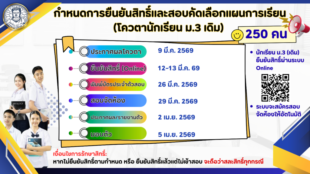 ยืนยันสิทธิ์นักเรียนโควต้า – วันพฤหัสบดีที่ 12 มีนาคม พ.ศ. 2569 ถึงวันศุกร์ที่ 13 มีนาคม พ.ศ. 2569